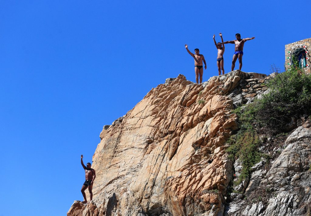Al filo de La Quebrada, un acantilado de más de 40 metros de altura, donde las fuertes olas impactan las rocas y el agua cuenta con más de 4 metros de profundidad, 6 mexicanos comenzaron con el primer show, de los cuales 2 eras menores de edad, seguidos de un clavado doble y otros 3 clavados de una altura de 28 y 35 metros.