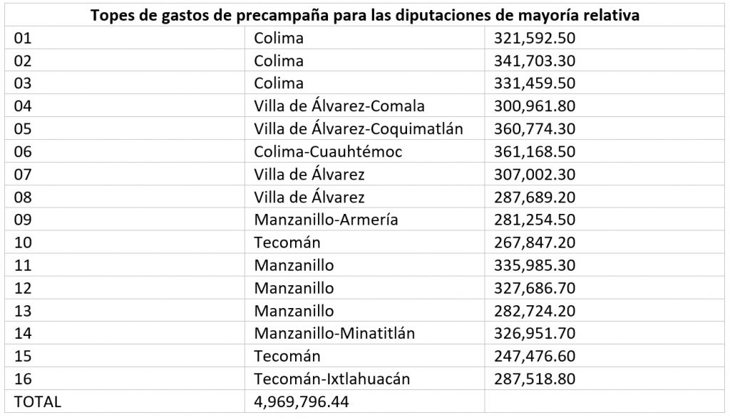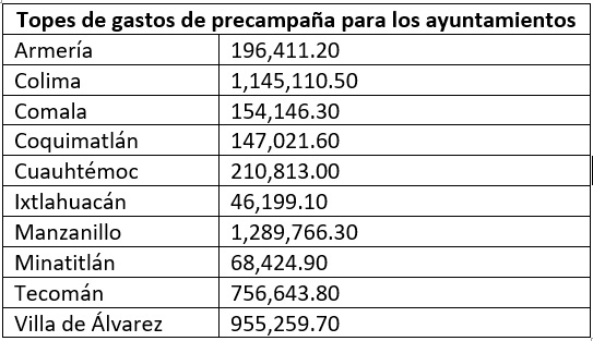 El Consejo General del Instituto Electoral del Estado de Colima (IEEC) aprobó el acuerdo que establece los topes de gastos de precampaña y el período para la obtención del respaldo ciudadano para las candidaturas independientes a las 10 alcaldías de la entidad y a las diputaciones locales de mayoría relativa.