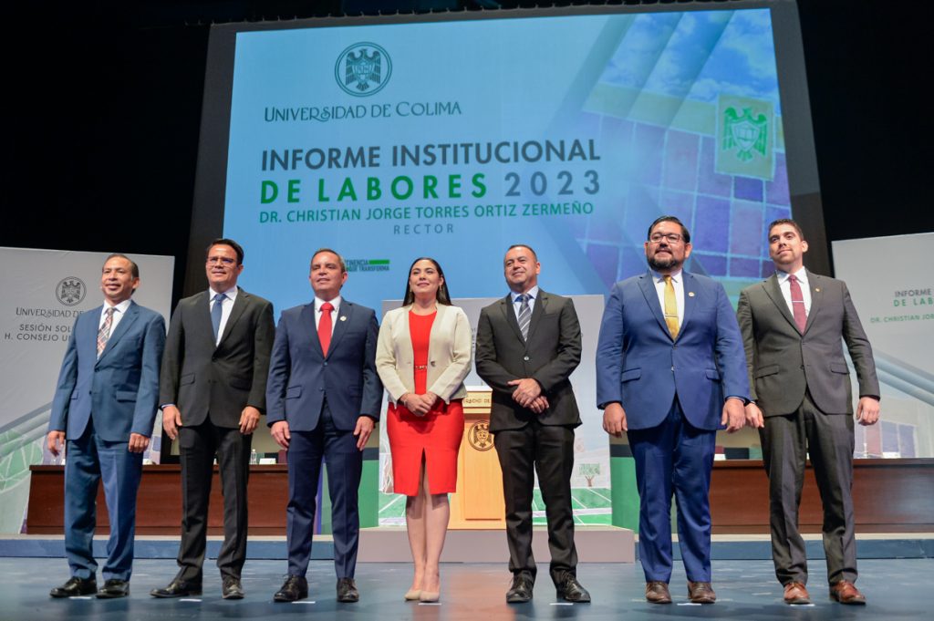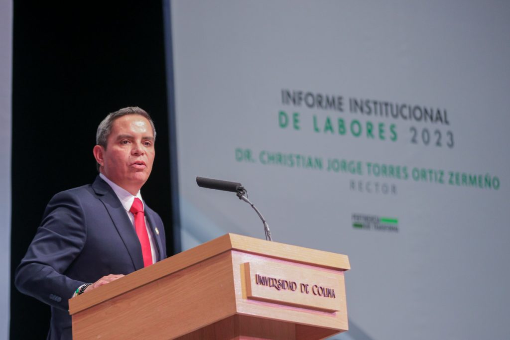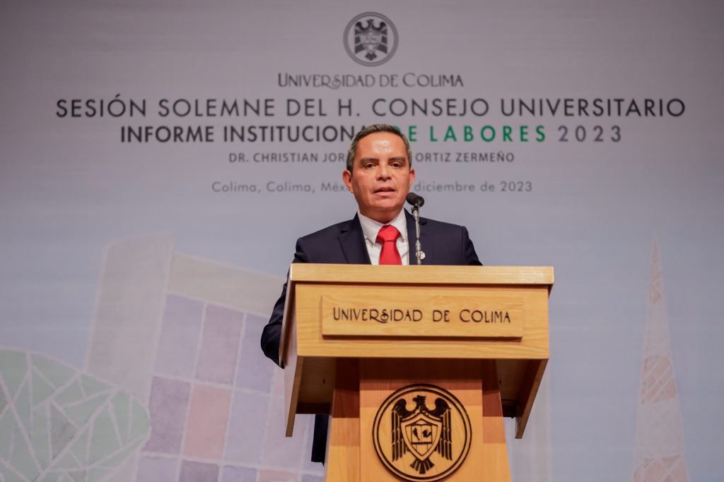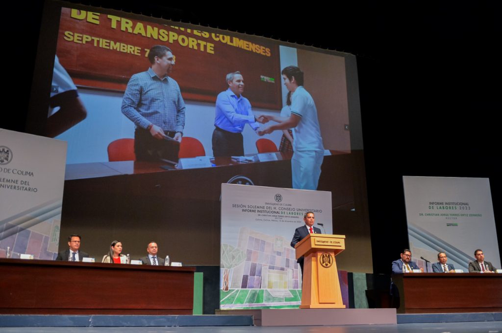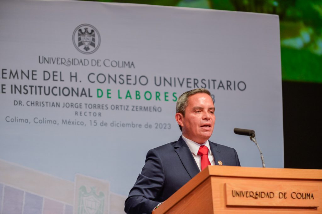 Ante un Teatro Universitario lleno de invitados y concejales integrantes del Consejo Universitario, máximo órgano de Gobierno de la Universidad de Colima, el Rector Christian Jorge Torres Ortiz Zermeño informó a la comunidad universitaria y a la sociedad en general sobre las acciones más importantes realizadas por la institución educativa a lo largo de este 2023.