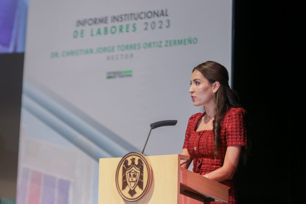 Zhared Pérez-Pérez, profesora de tiempo completo del Bachillerato 15, en nombre de las y los integrantes de la Comisión de Glosa, leyó el dictamen en el que fue aprobado el Tercer Informe de Labores del doctor Christian Jorge Torres Ortiz Zermeño, “porque cumple plenamente con lo establecido en la Ley Orgánica de la Universidad. El informe presenta de manera clara y analítica los logros y avances de la institución durante el tercer año de su gestión, acorde con los parámetros del Plan Institucional de Desarrollo 2022-2025”.