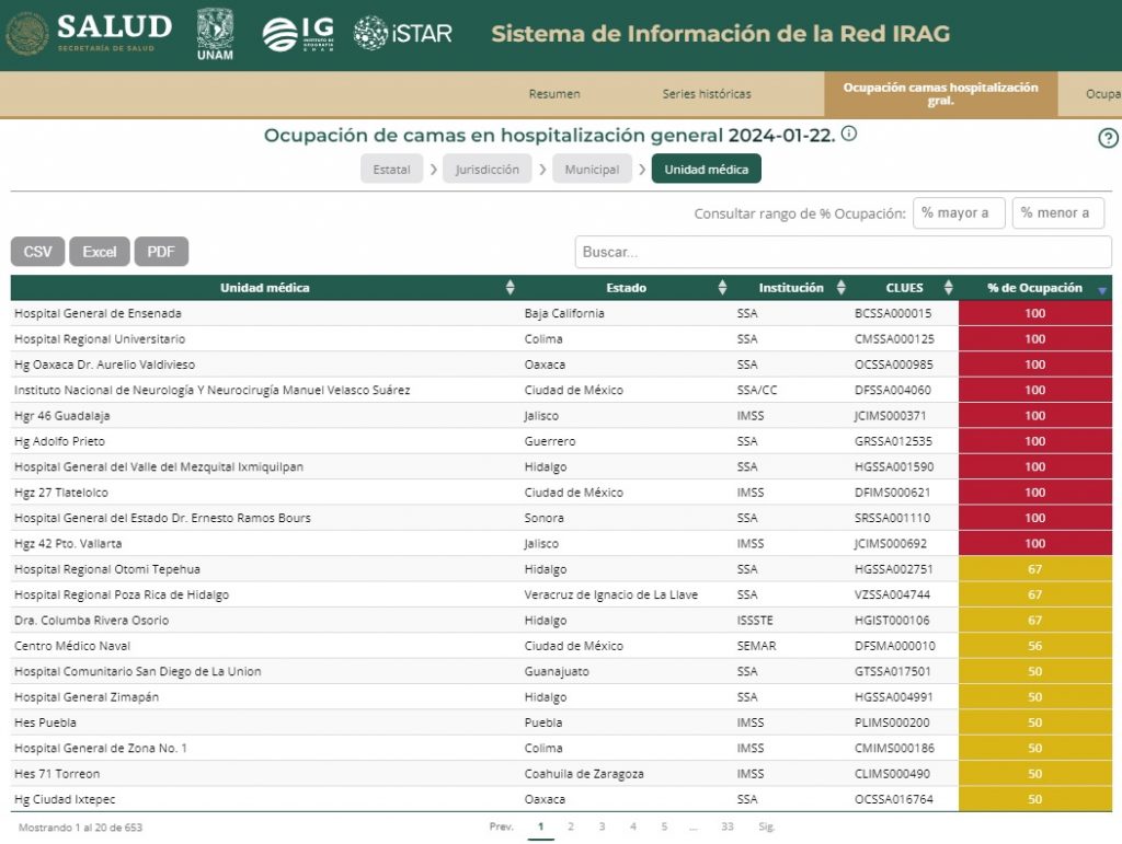 De acuerdo con datos al 22 de enero que arroja el Sistema de Información de la Red de Influenza e Infecciones Respiratorias Agudas Graves (IRAG), el Hospital Regional Universitario (HRU), ubicado en la ciudad de Colima, registra un 100% de ocupación de camas de hospitalización general.