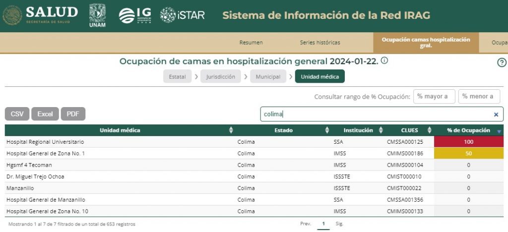 El sistema registra datos de 7 hospitales de salud pública ubicados en los municipios de Colima, Manzanillo, Tecomán y Villa de Álvarez. Así, al 22 de enero el Hospital General de la Zona Número 1 del Instituto Médico del Seguro Social (IMSS), ubicado en Villa de Álvarez, registra un 50% de ocupación de camas de camas de hospitalización general.