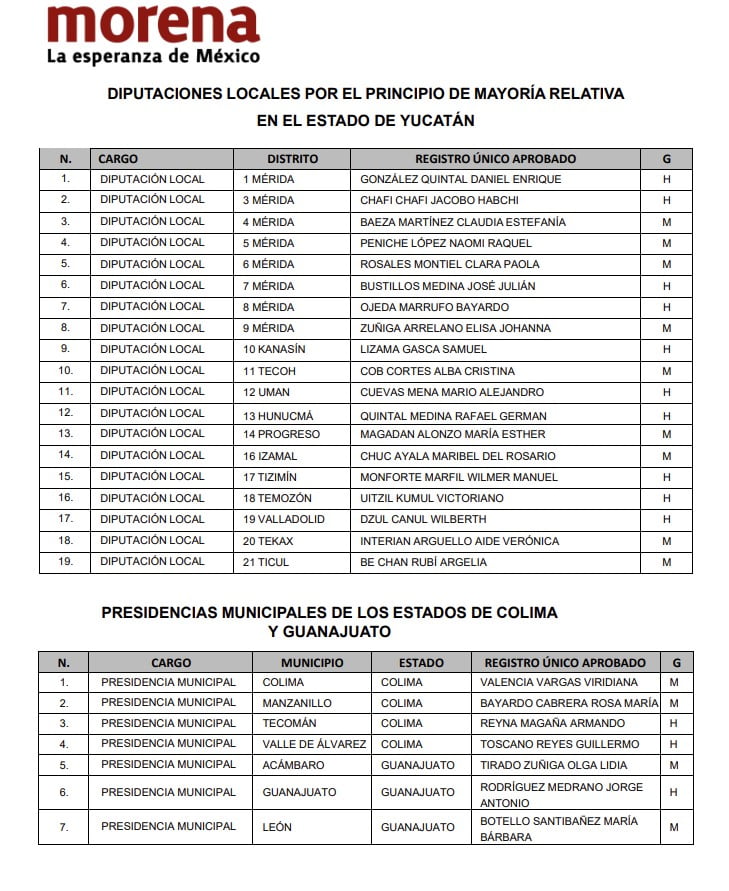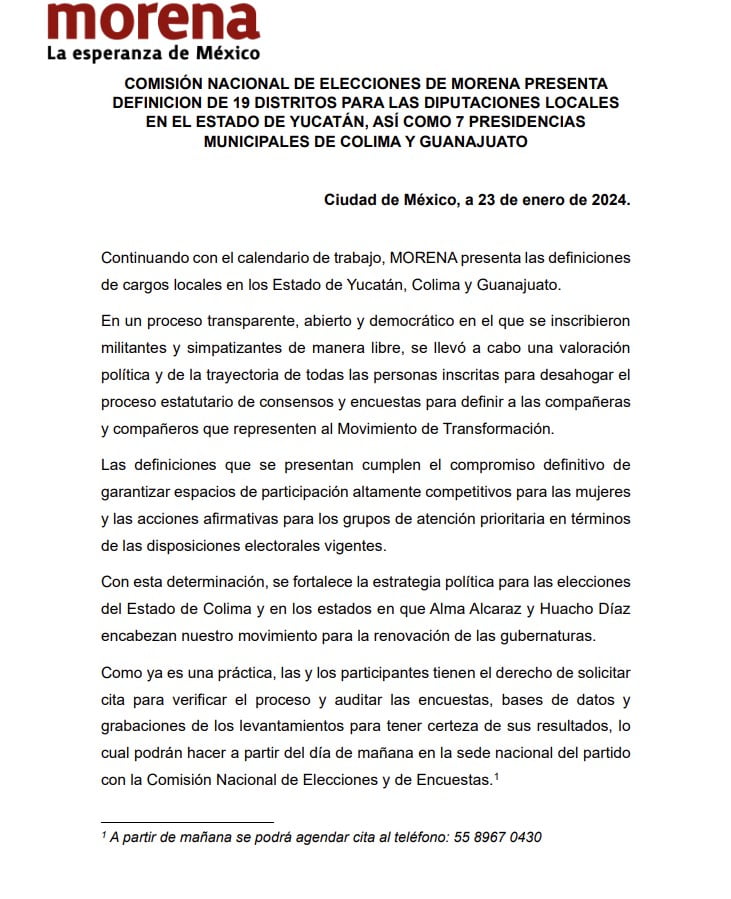 El comunicado apunta que “en un proceso transparente, abierto y democrático en el que se inscribieron militantes y simpatizantes de manera libre, se llevó a cabo una valoración política y de la trayectoria de todas las personas inscritas para desahogar el proceso estatuario de consensos y encuestas, para definir a las compañeras y compañeros que representan el Movimiento de la Transformación”.