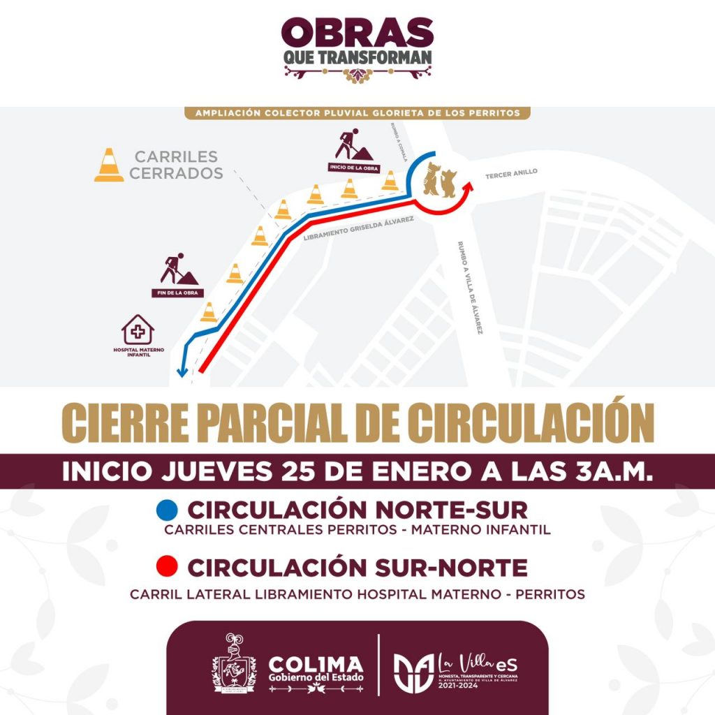 El Gobierno del estado y el Ayuntamiento de Villa de Álvarez informan que, debido a los trabajos de ampliación del colector pluvial en la glorieta de Los Perritos, a partir de este jueves 25 de enero se realizará un cierre en 800 metros de vialidad en sentido norte-sur, partiendo de la glorieta en dirección al libramiento Gobernadora Griselda Álvarez.