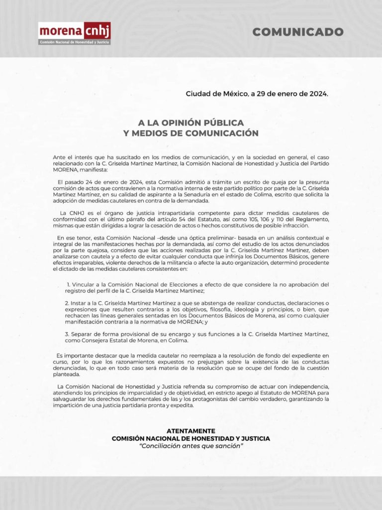 A través de un comunicado de prensa, la Comisión Nacional de Honestidad y Justicia del Partido Morena, informó que ha decidido dictar medidas cautelares en contra de la alcaldesa de Manzanillo, Griselda Martínez, tras las declaraciones que realizó a un medio nacional.