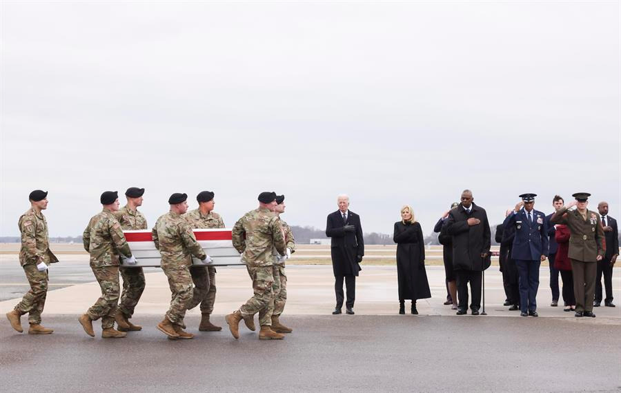 El presidente de Estados Unidos, Joe Biden, participó en la ceremonia de recibimiento de los féretros con los 3 militares estadounidenses muertos la semana pasada en el ataque con dron de milicias proiraníes en Jordania.