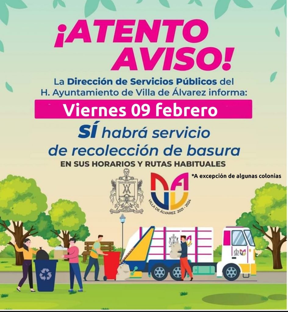 El Ayuntamiento de Villa de Álvarez informó que este viernes (9) el servicio de recolección de basura se prestará de manera habitual, con excepción del adelanto de los turnos vespertino y nocturno en algunas colonias.