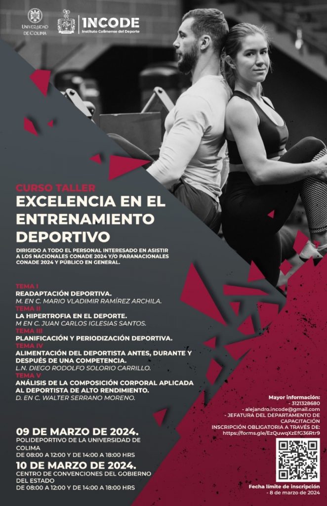 El Instituto Colimense del Deporte (Incode), en coordinación con la Universidad de Colima, realizará el 9 y 10 de marzo próximo el curso-taller “Excelencia en el Entrenamiento Deportivo” con la finalidad de preparar y actualizar al personal interesado en asistir a los Nacionales y/o los Paranacionales Conade 2024, informó el director general de esta dependencia, Alejandro Rodríguez Alvarado.