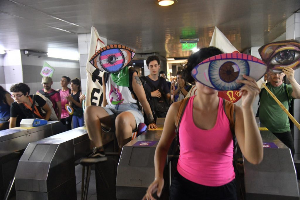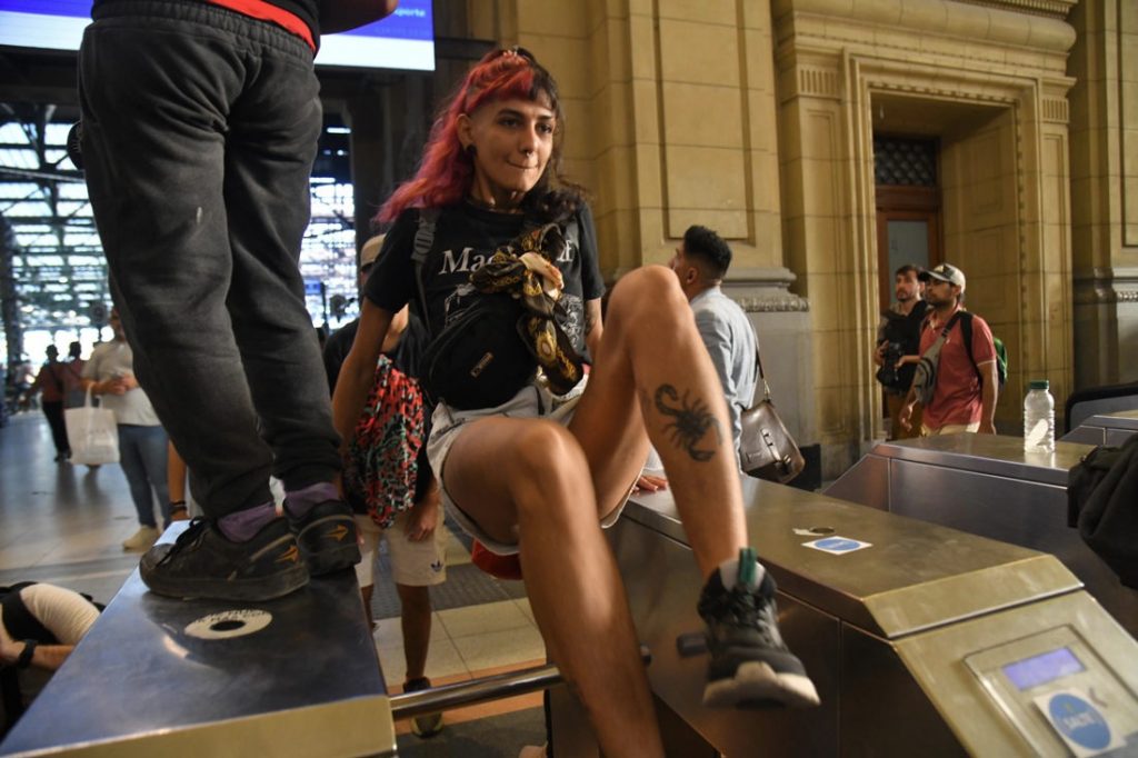 En medio de una manifestación con carteles llamando a la lucha -incluyendo una bandera palestina– y cánticos, tanto jóvenes como personas adultas saltaron los molinetes de las estaciones de tren de la capital argentina -Plaza Miserere y Constitución y Retiro- y también en La Plata, la capital de la provincia de Buenos Aires.