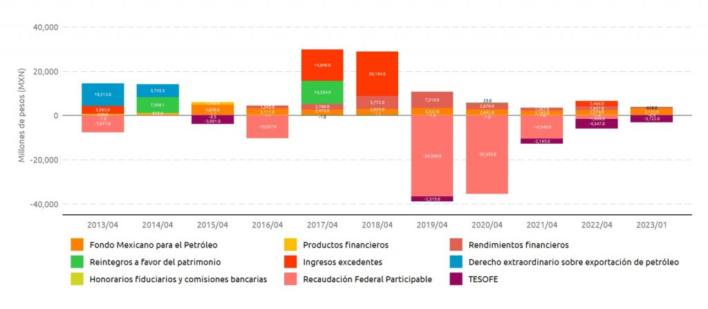 “En México, los recursos de los fondos de estabilización se utilizaron en 2019 y, posteriormente, en 2020 tras la crisis generada por la pandemia de Covid-19. Pese a que durante 2021 y 2022 se registraron ingresos excedentes por más de 420 mil mdp cada año, dichos fondos de estabilización no han logrado reconstituirse”.