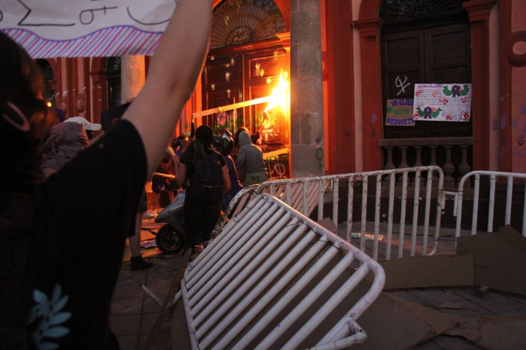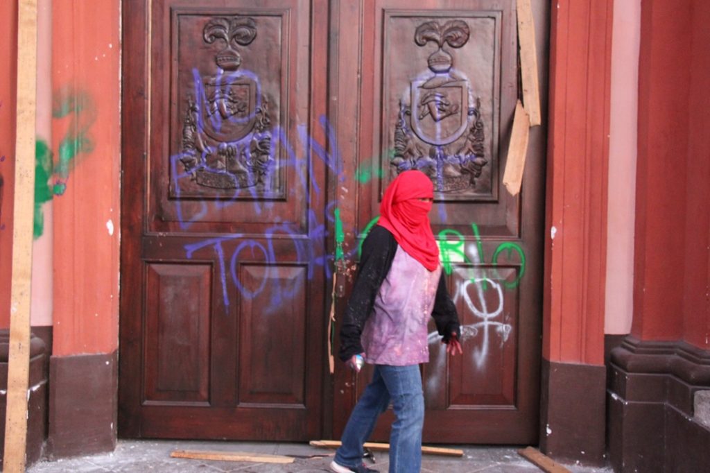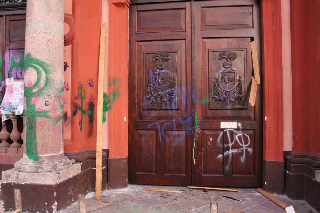 Luego de que la fachada de Palacio de Gobierno quedó al descubierto, procedieron a realizar pintas y tratar de derribar las puertas principales de entrada; a pesar de que no lo lograron tumbarlas por completo, sí consiguieron quebrarlas e incendiar algunos restos de madera.