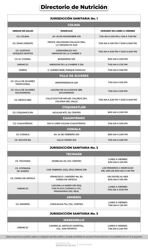 Te compartimos en el gráfico anexo las unidades de salud, el domicilio exacto y los horarios para -de necesitarlo- solicites la atención en esta área de Nutrición, con tu médica o médico tratante.