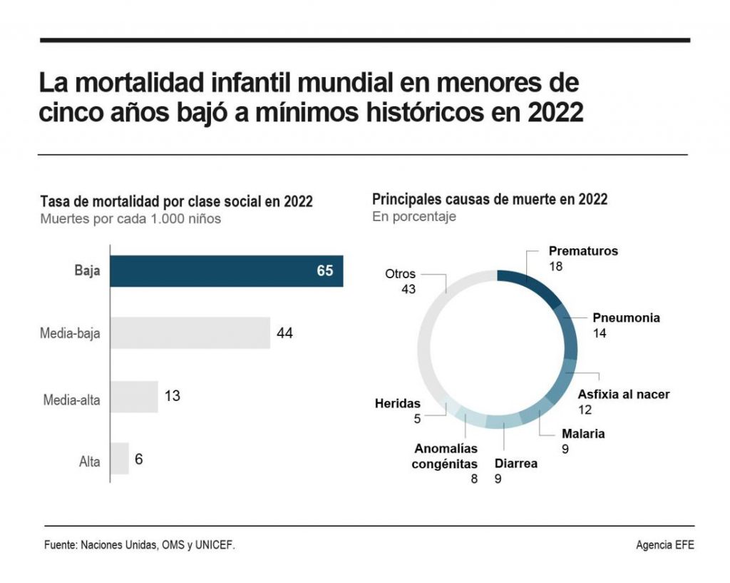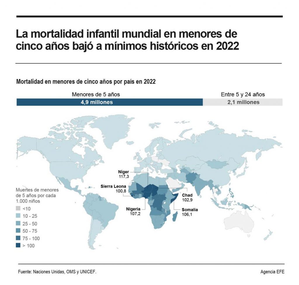 A nivel global, fallecieron en 2022 casi 4.9 millones de niños de entre 0 y 5 años en el Mundo, más de la mitad (2.7 millones) en el África Subsahariana, mientras que los recién nacidos fallecidos en el Mundo fueron 2.3 millones, entre ellos más de un millón en la mencionada región africana.