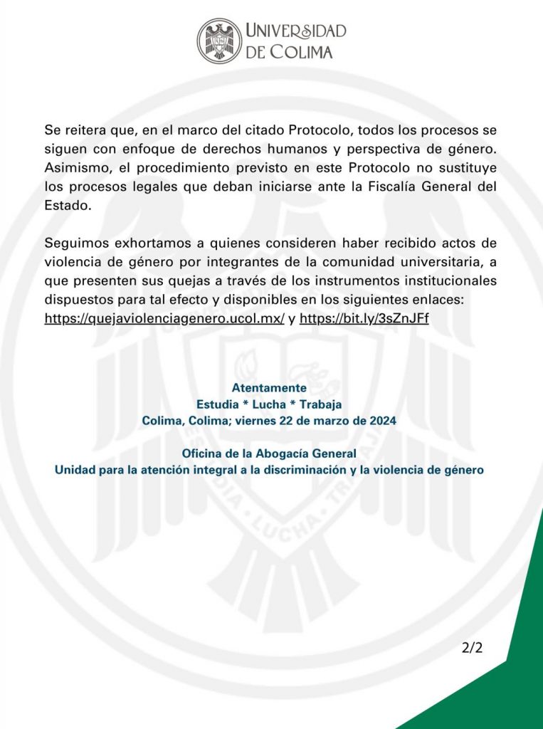 En un comunicado oficial, la Universidad de Colima informa que acorde con el compromiso institucional y ético de cero tolerancia al hostigamiento sexual, acoso sexual y discriminación, les han sido rescindidos contratos a un trabajador de nivel medio superior y a un prestador de servicios independiente, en el marco del procedimiento previsto en el Protocolo para la Atención Integral de la Violencia de Género.