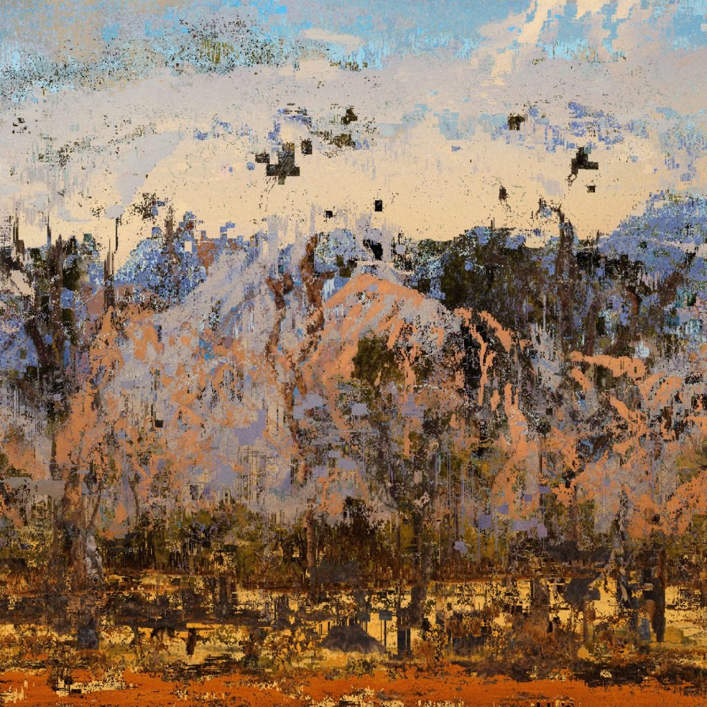 Helio Santos participa en ese libro con una obra que llamó “Perennial absence II”, en la que realizó un paisaje generativo mediante una computadora y utilizando imágenes sintéticas. Lo realizó con un algoritmo que combina aleatoriamente paisajes generados mediante la Inteligencia Artificial y superponiendo capas de color.