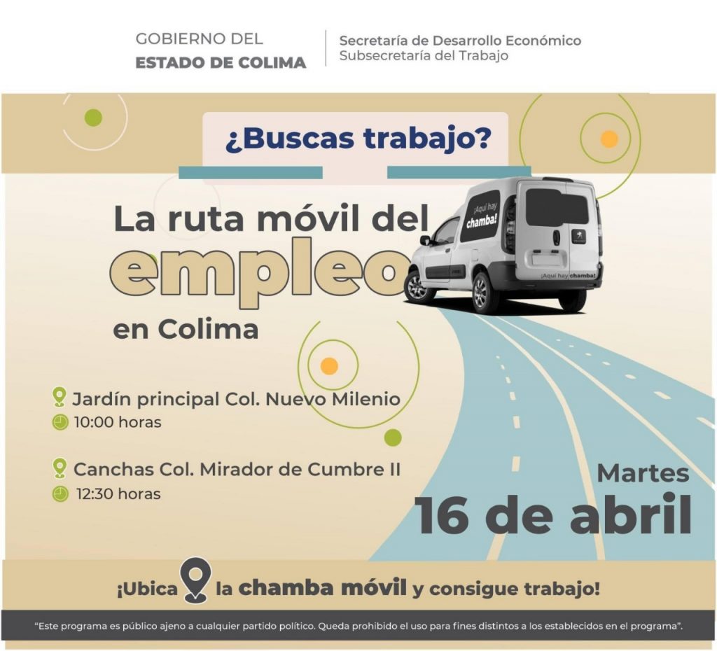 Con el objetivo de acercar la oferta laboral a familias de las colonias populares y comunidades rurales del estado de Colima, varias de las cuales no pueden acudir a las oficinas, la Subsecretaría del Trabajo, a través de la Dirección de Empleo del Servicio Nacional de Empleo Colima, recorrerá este martes 16 de abril, con la Ruta Móvil del Empleo, puntos estratégicos de la zona oriente de la capital colimense.