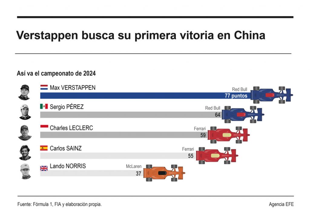 El neerlandés Max Verstappen (Red Bull), triple campeón del Mundo y líder del Mundial de Fórmula 1, aspira a festejar su primera victoria en China, en un Gran Premio que retorna al calendario después de 5 años de ausencia y que se disputará en el circuito de Shanghái, sede del primer fin de semana con formato sprint de la temporada.