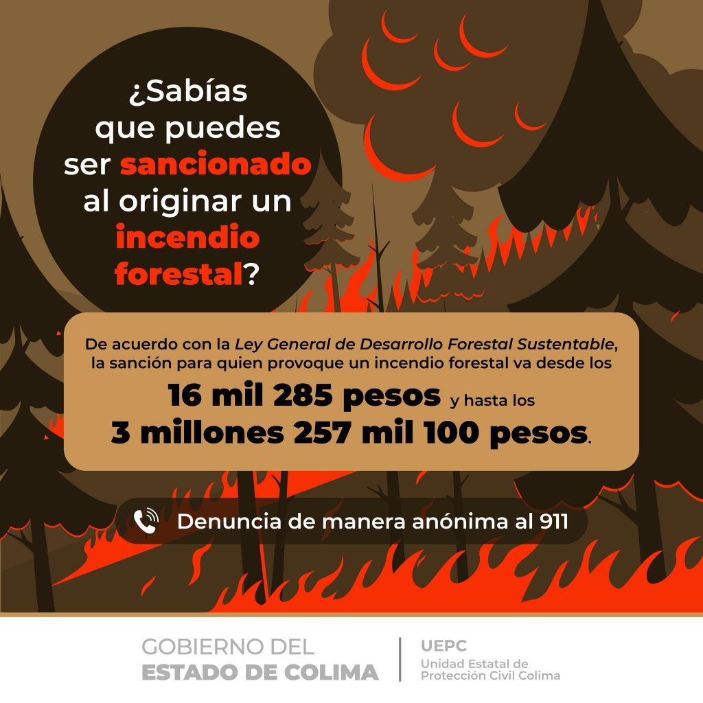 La gobernadora compartió una infografía donde se lee: “¿Sabías que puedes ser sancionado al originar un incendio forestal? De acuerdo a la Ley General de Desarrollo Forestal Sustentable, la sanción para quien provoque un incendio forestal va desde los 16 mil 285 pesos y hasta los 3 millones 257 mil 100 pesos”.