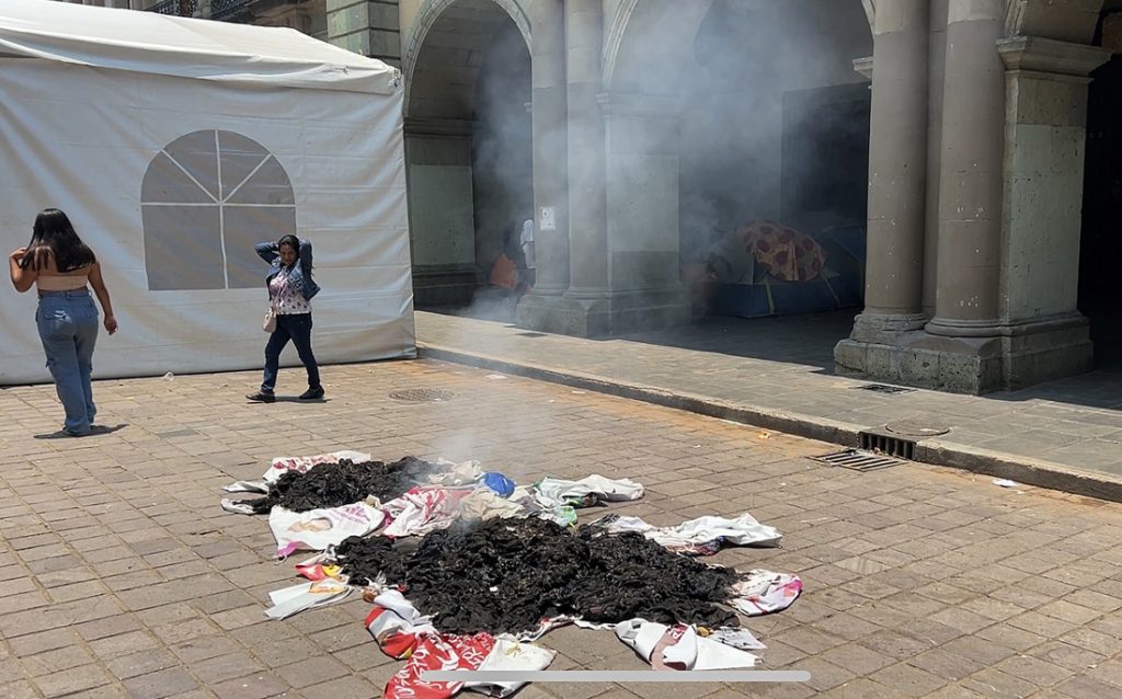 Al final, una parte de la propaganda electoral fue incendiada frente al palacio de Gobierno de Oaxaca, el resto, como gorras, camisetas y lonas de campaña, fueron acumuladas en la mesa central del plantón de los maestros de la CNTE, “la devolveremos (la propaganda electoral) después del 2 de junio”, dijo uno de los maestros que participó en el retiro del material.
