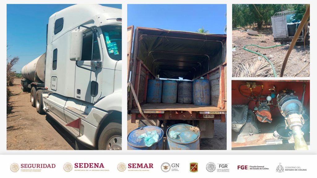 En estas diligencias se aseguraron más de 110 tambos con gasolina y más de 50 bidones; también se aseguraron una camioneta, un camión, una pipa y distintos elementos utilizados para la distribución del combustible.
