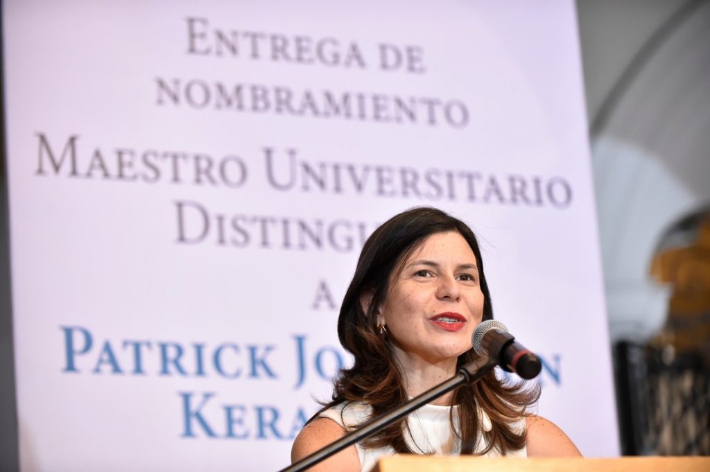 Ada Aurora Sánchez, catedrática de la Facultad de Letras y Comunicación (Falcom), fue la encarga de leer el dictamen con el cual la UdeC le otorga el nombramiento de Maestro Universitario Distinguido al doctor Patrick Johanson Keraudren “por su trascendental trayectoria en pro de la defensa, promoción y conservación de las lenguas, la literatura y la cultura indígena de nuestro país”.