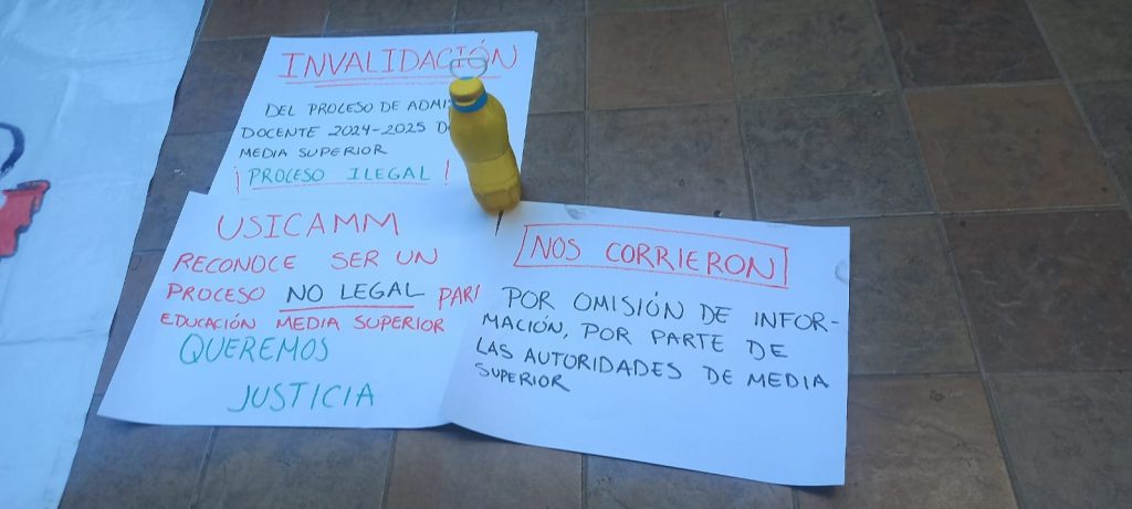 En las pancartas se leen reclamos como la invalidación del proceso de admisión docente 2024-2025 de educación media superior. Asimismo, demandaron basificación, homologación, respeto de bono del maestro, convocatorias a centros de trabajo, entre otras demandas de carácter nacional.