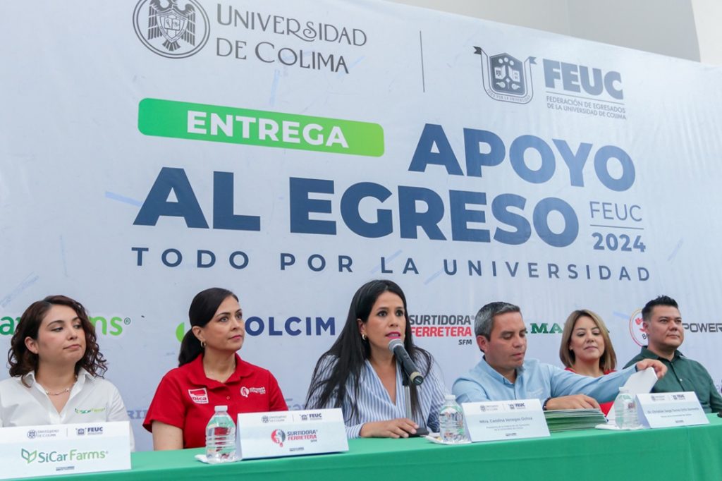 La beca se llama Apoyo al Egreso FEUC 2024 y contó con el patrocinio de varias empresas asentadas en la entidad. La ceremonia en la que se entregaron dichos apoyos se realizó en el edificio de la FEUC y fue presidida por el Rector de la Universidad de Colima (UdeC), Christian Jorge Torres Ortiz Zermeño, y Carolina Venegas Ochoa, presidenta de esta federación.