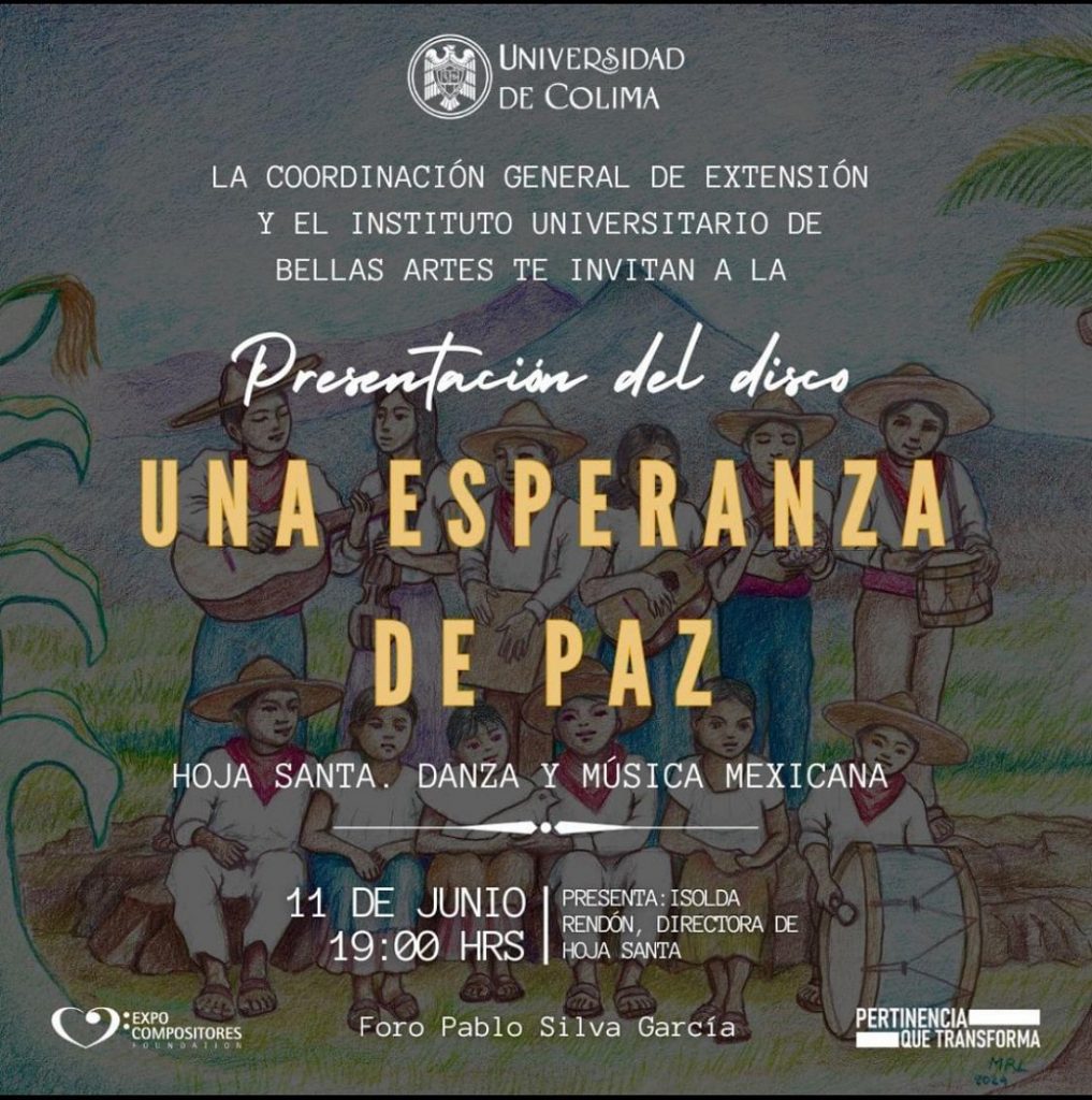 Este martes 11 de junio, en punto de las 7 de la tarde, se realizará la presentación del disco EP“Una esperanza de paz, del grupo de danza y música mexicana Hoja Santa, en el Foro “Pablo Silva García” de la Universidad de Colima (UdeC). El disco es un mensaje musical a las nuevas generaciones sobre la importancia del cuidado del medio ambiente y la cultura de paz.